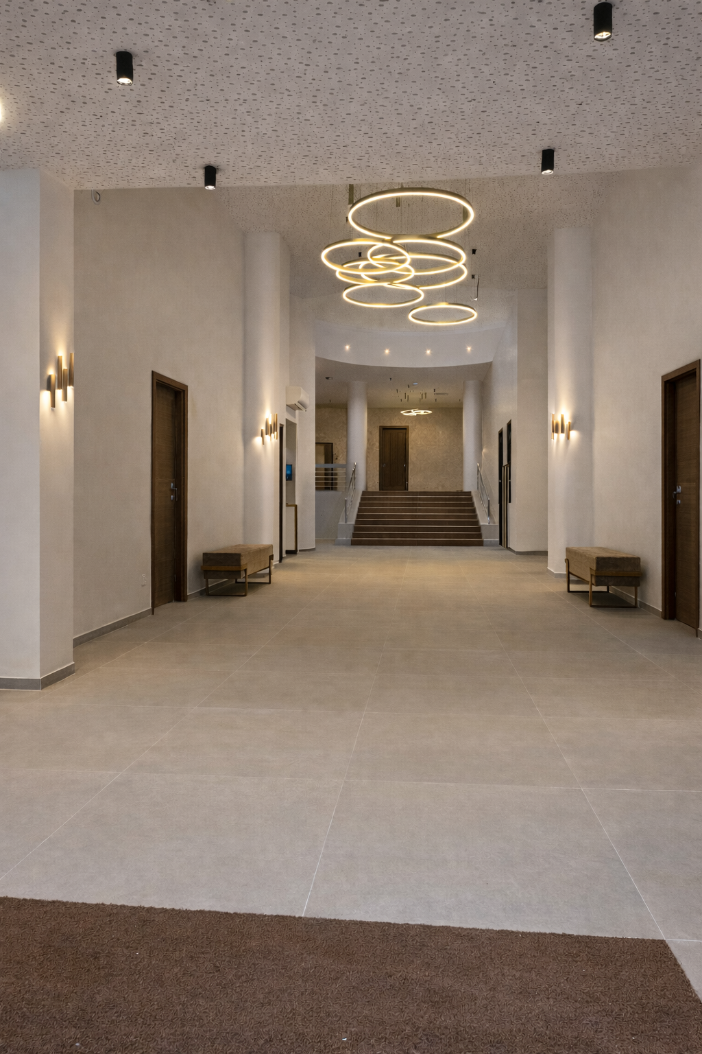 Les luminaires, aux géométries épurées et à la présence affirmée, participent à l'identité architecturale du cabinet. Le bois et les enduits à la chaux contribuent au confort ressenti en créant une atmosphère sereine et saine. Des plafonds acoustiques viennent traiter la perception sonore de ces grands volumes.
