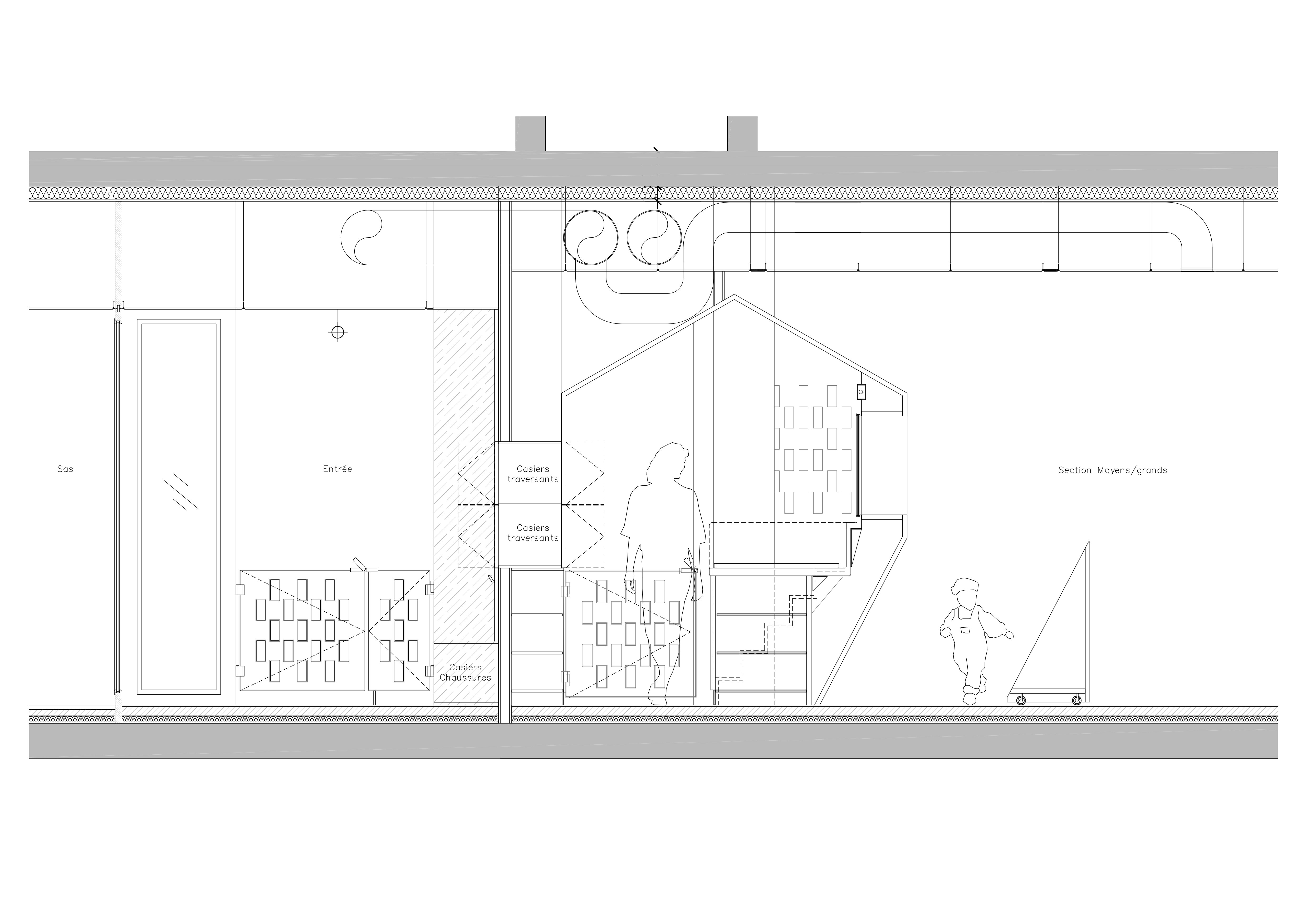 Une approche sensorielle et ergonomique, pensée spécifiquement pour les jeunes enfants, a guidé la conception de chaque espace, adapté aux âges et aux usages. La section des tout-petits se distingue par ses lignes courbes et ses aménagements au plus près du sol, favorisant l'accessibilité. Celle des plus grands propose des volumes plus affirmés, conçus pour stimuler leur curiosité et inviter à l'exploration. Une salle de jeux d'eau fait le lien entre ces deux univers. La transparence entre les espaces offre une lecture d'ensemble de l'établissement tout en assurant la sécurité des enfants, tandis que la lumière circule librement. L'acoustique et l'éclairage ont fait l'objet d'études spécifiques afin de garantir confort et souplesse d'utilisation pour chaque espace, de manière indépendante.