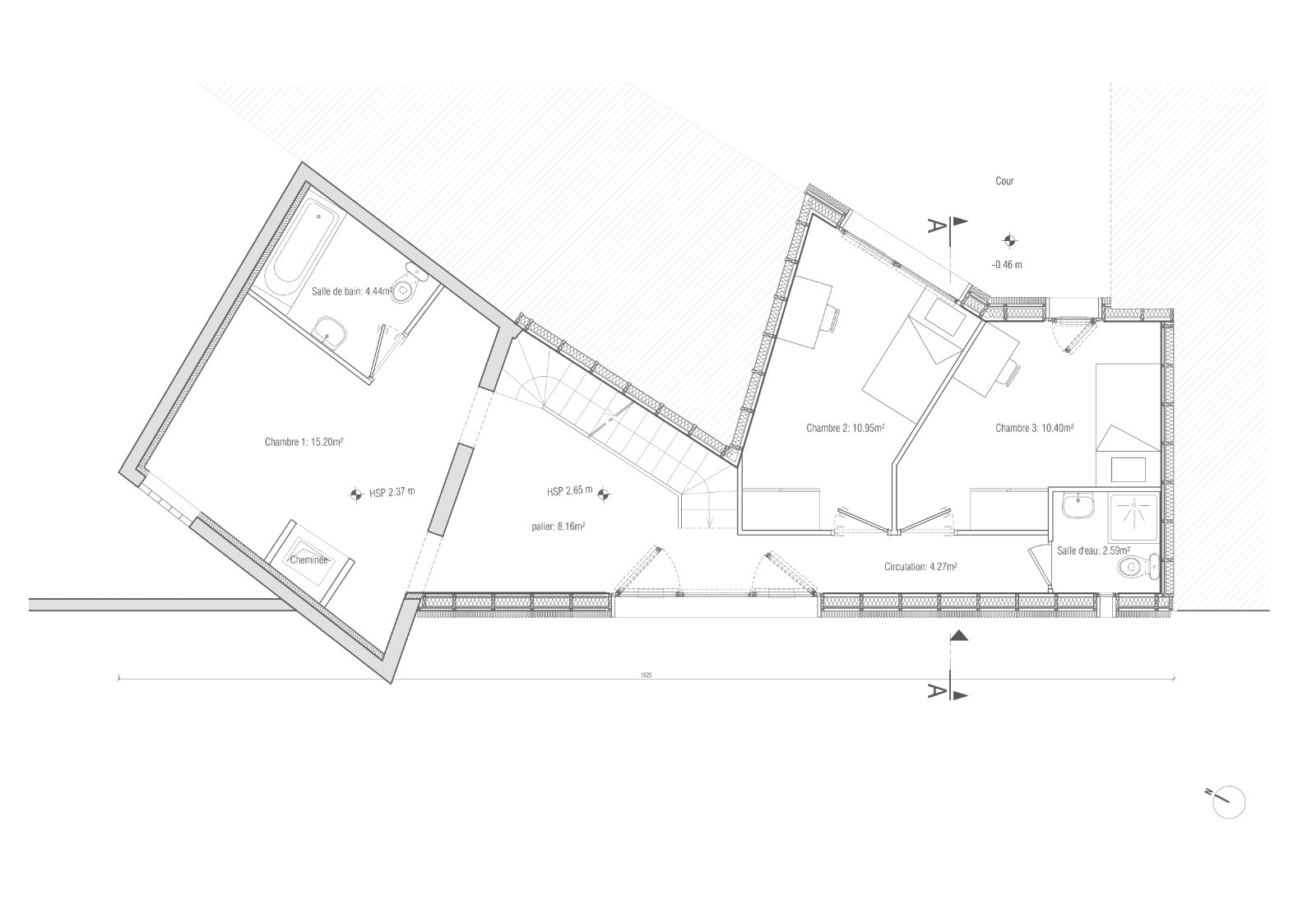 Le volume de l'édicule en toiture se déploit sur la terrasse en réponse à la géométrie angulaire de la façade intérieure.