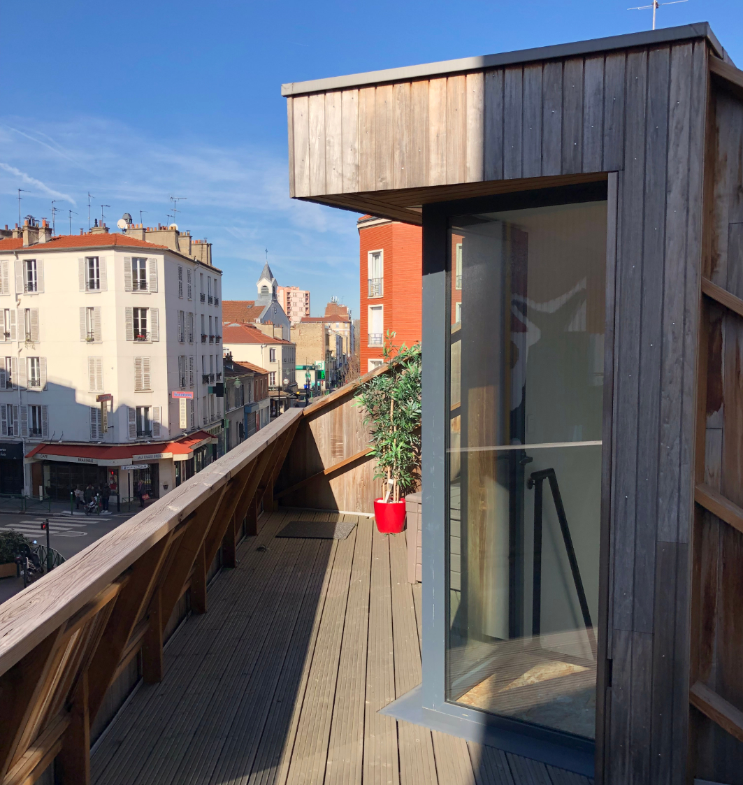 Surélévation en ossature bois . Création de 2 chambres, d'un espace bureau, d'une SdE et d'un rooftop.